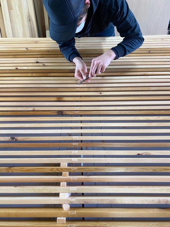 こちらは大工さんが手作りしています。細い木材を正確に組み上げて一つのルーバーが出来上がっています。