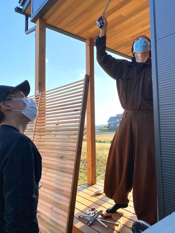 大きなウッドデッキに取り付けられた目隠しのルーバー。