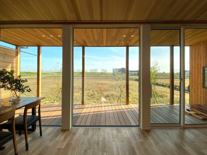 土手のある拓けた田園風景を室内に取り込む大きな窓とウッドデッキ、